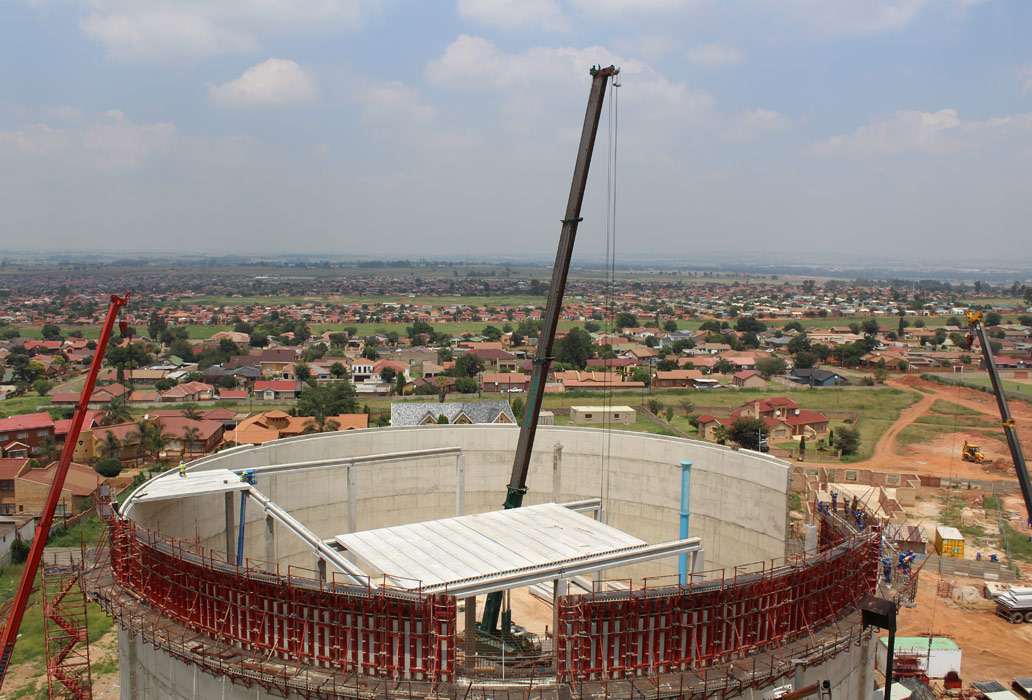 Corestruc starts dispatching the wall panels to the construction site on a just-in-time basis once the ring beam has been completed by the main contractor. They are lifted directly from our truck trailers and placed on top of the ring beam using our own mobile crane. The first panel is supported by props that are removed once it has set and the remaining precast-concrete elements are then placed against the other to complete the reservoir wall. Again, Total Station technology is used to precisely install each panel, with our team maintaining tolerances of about 5 mm. We are able to manufacture up to 10 reservoir wall panels of various widths and lengths at a time at our factories. This is in addition to the four buttresses that are used to reinforce the wall during the post-tensioning process.